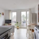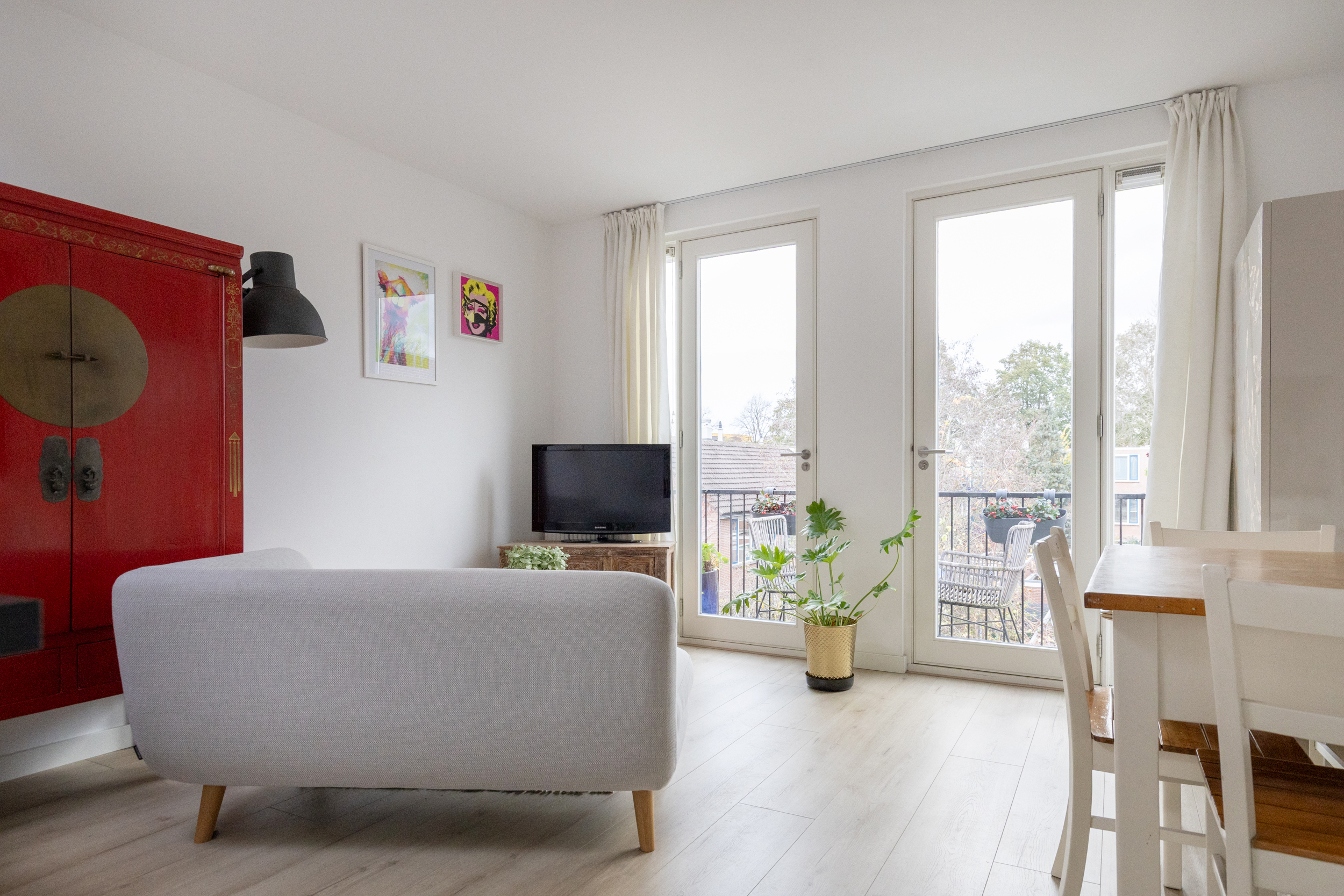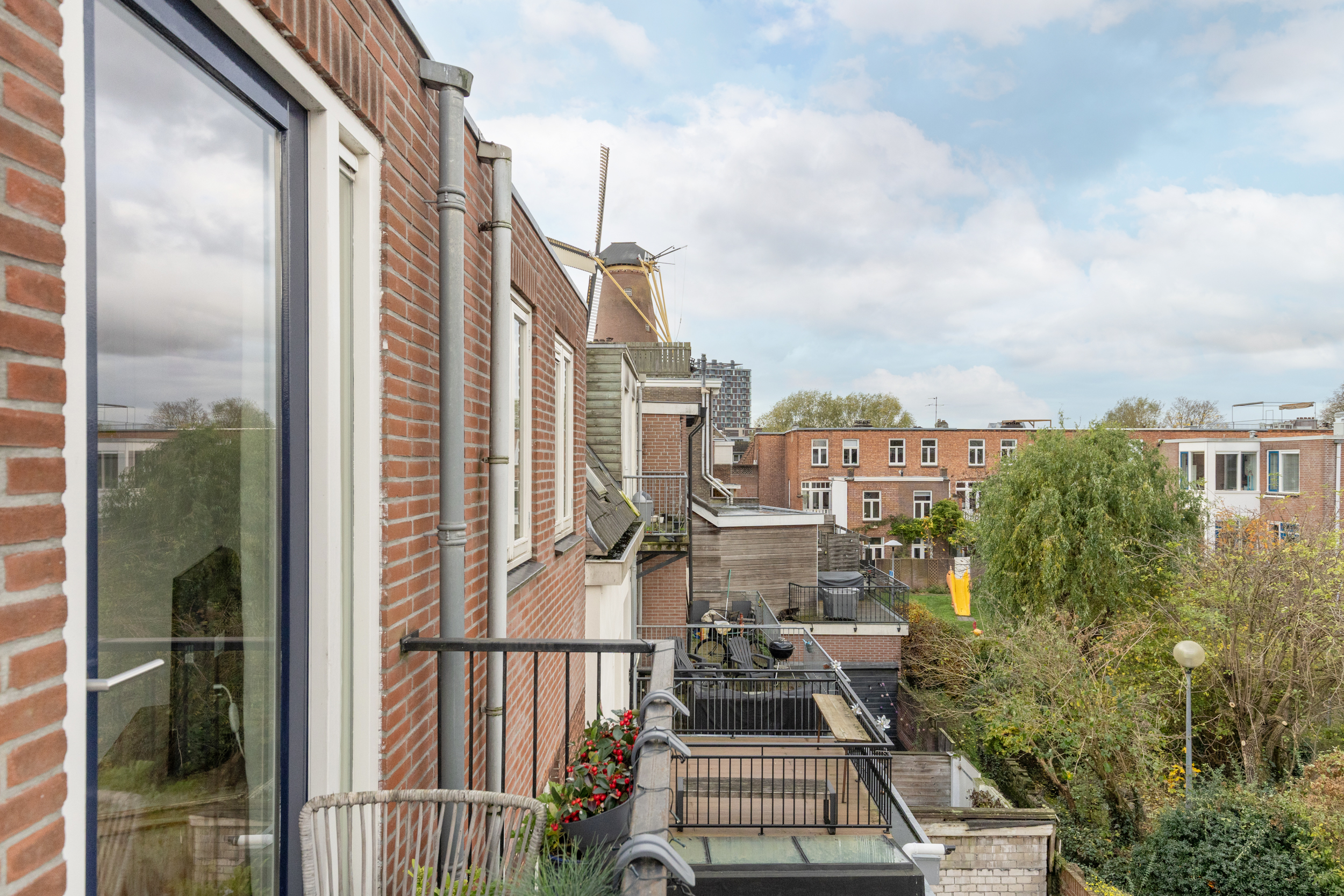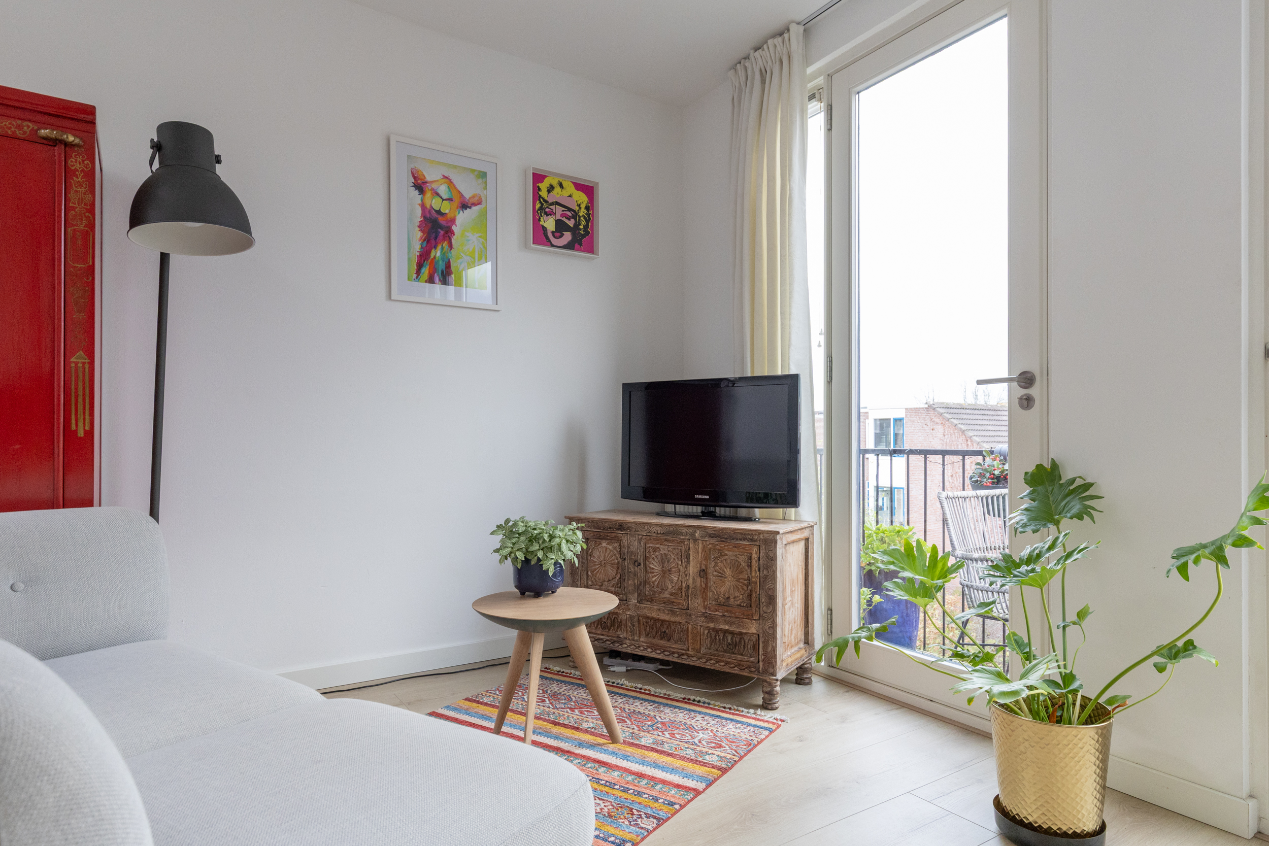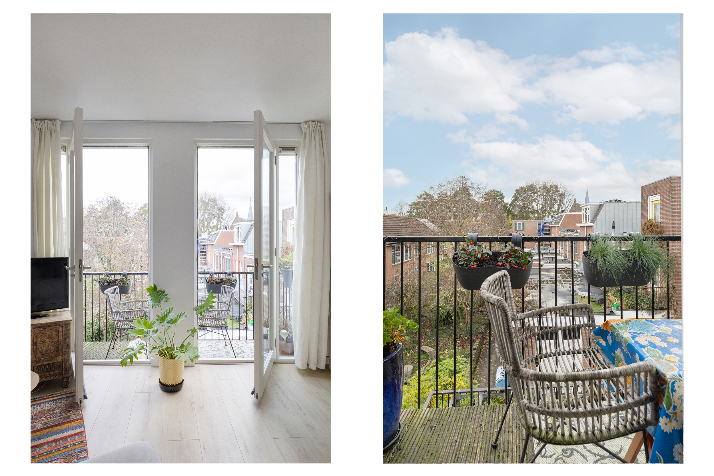 De tweede verdieping is de woonlaag, compact ingedeeld en slim benut. De woonkamer is licht en sfeervol, met twee deuren naar het balkon aan de achterzijde van de woning. Hier kun je heerlijk zitten in de buitenlucht, met uitzicht op de binnentuinen én de karakteristieke molen.