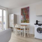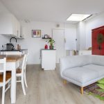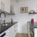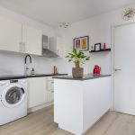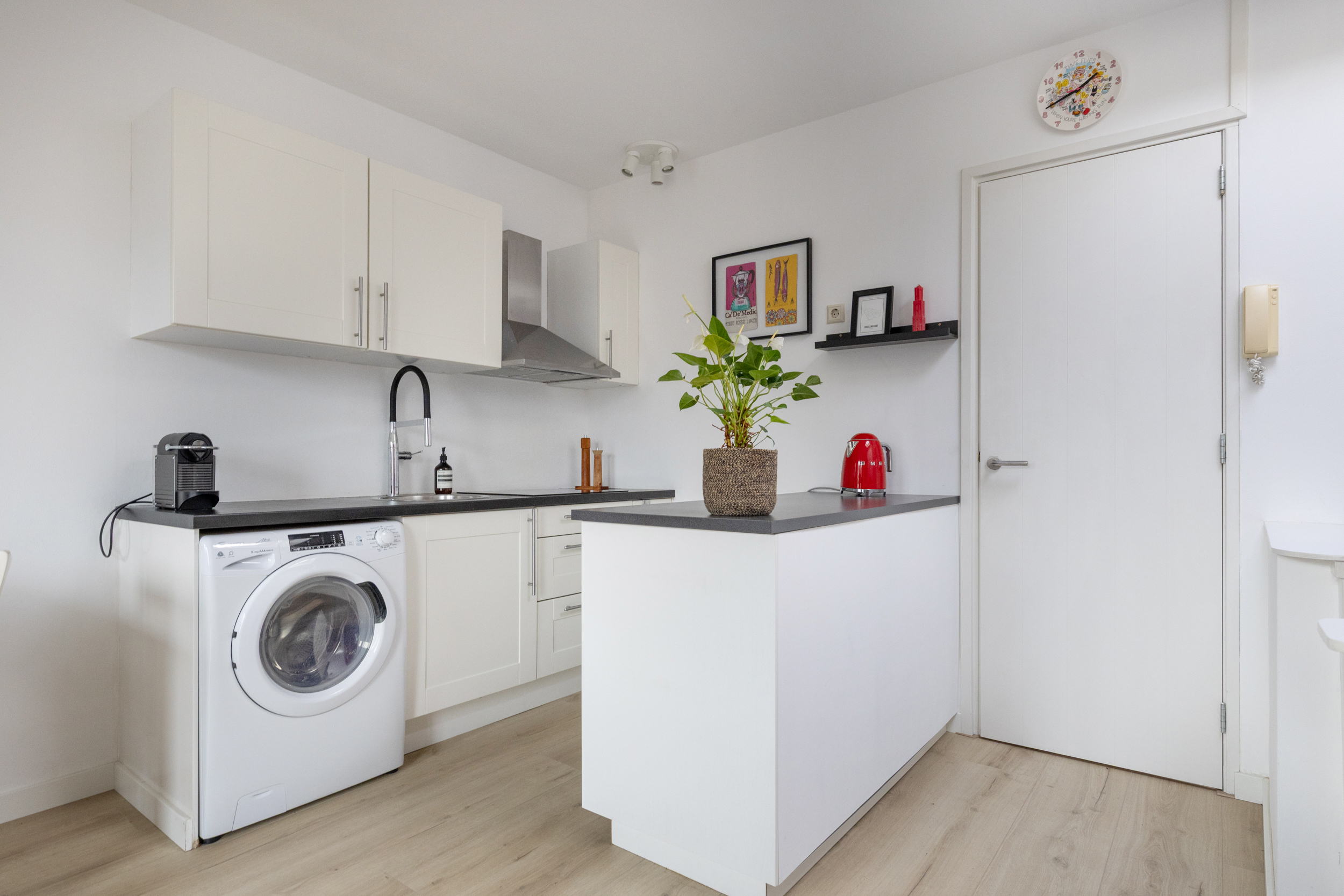 De open keuken is modern en voorzien van alles wat je nodig hebt: een inductiekookplaat, afzuigkap, oven, wasmachine-aansluiting en voldoende opbergruimte. Dankzij het dakraam valt er veel extra daglicht naar binnen, wat de ruimte nog frisser aan laat voelen.
