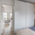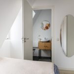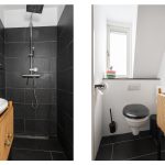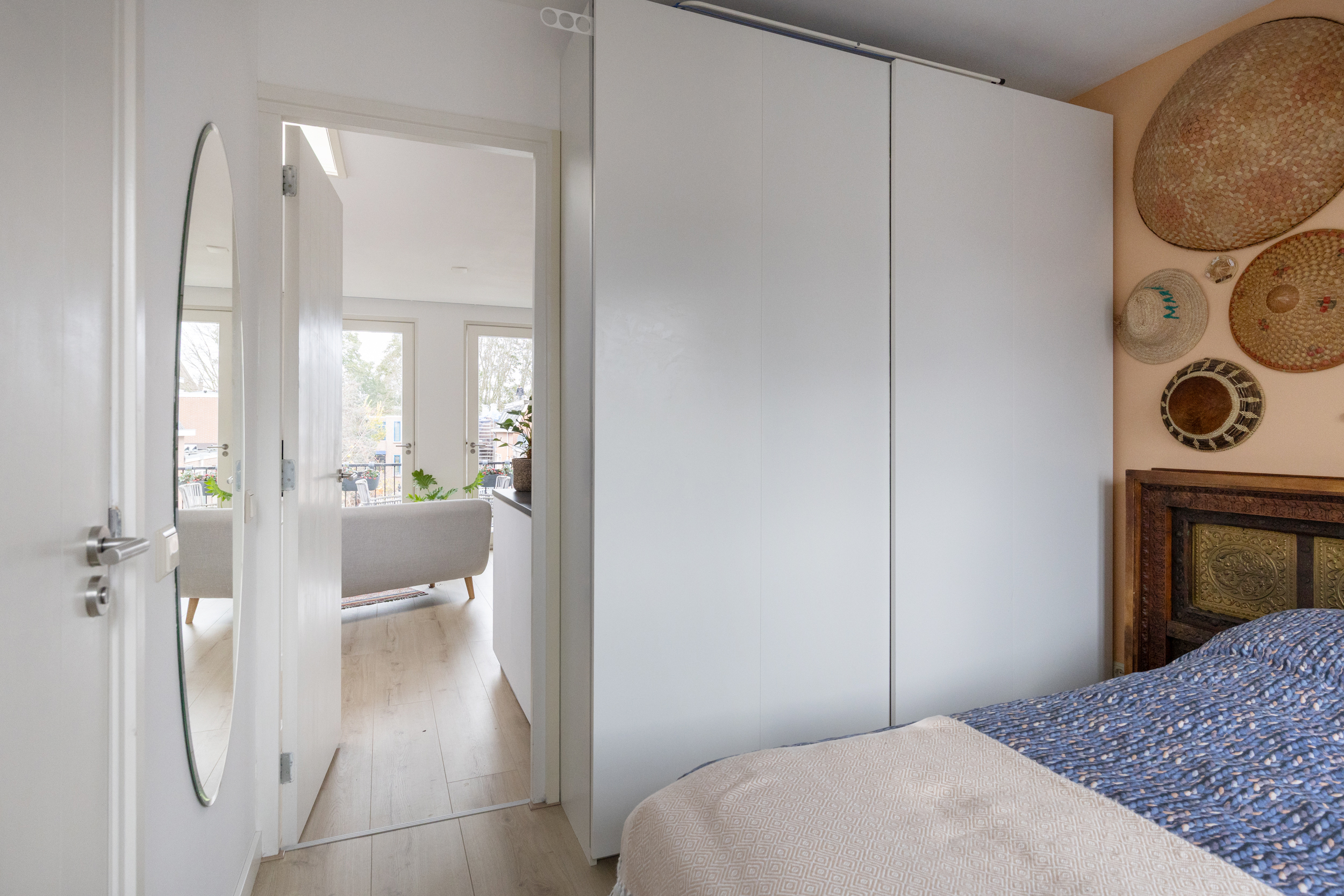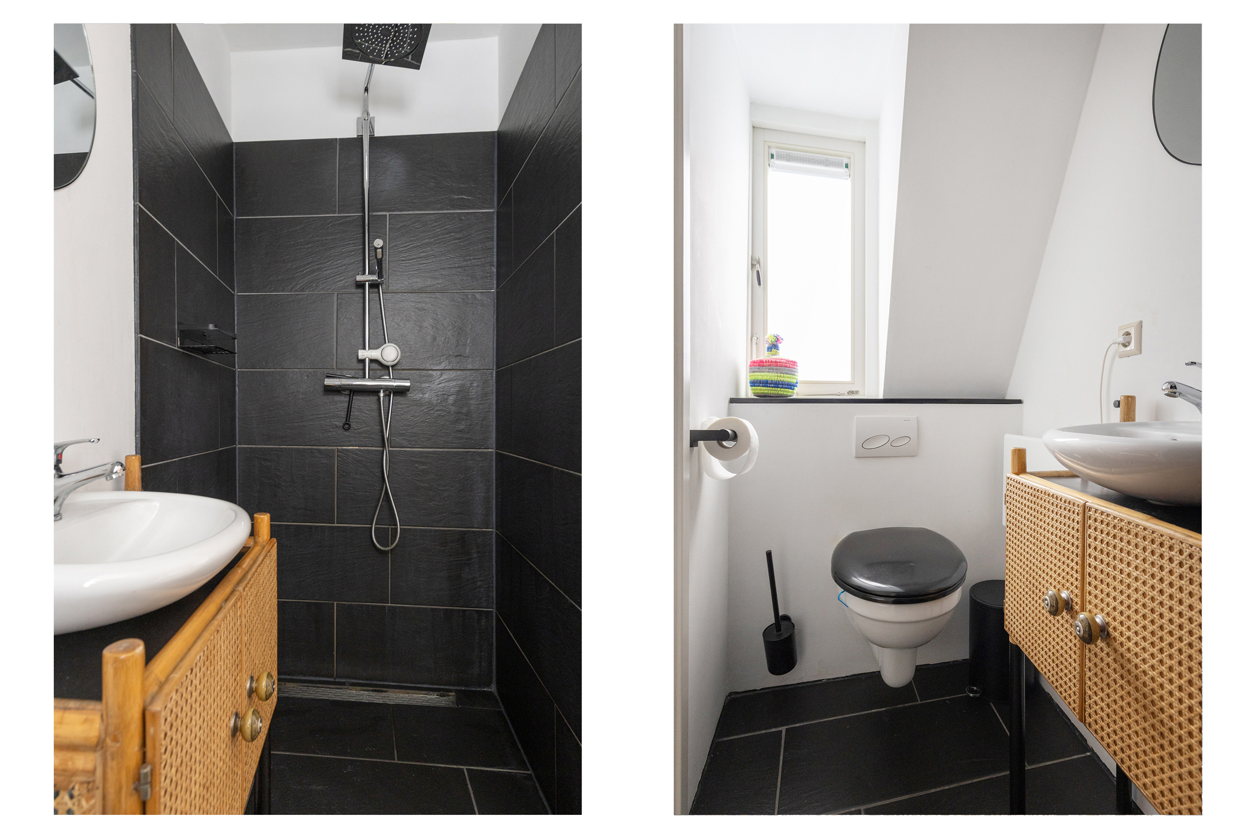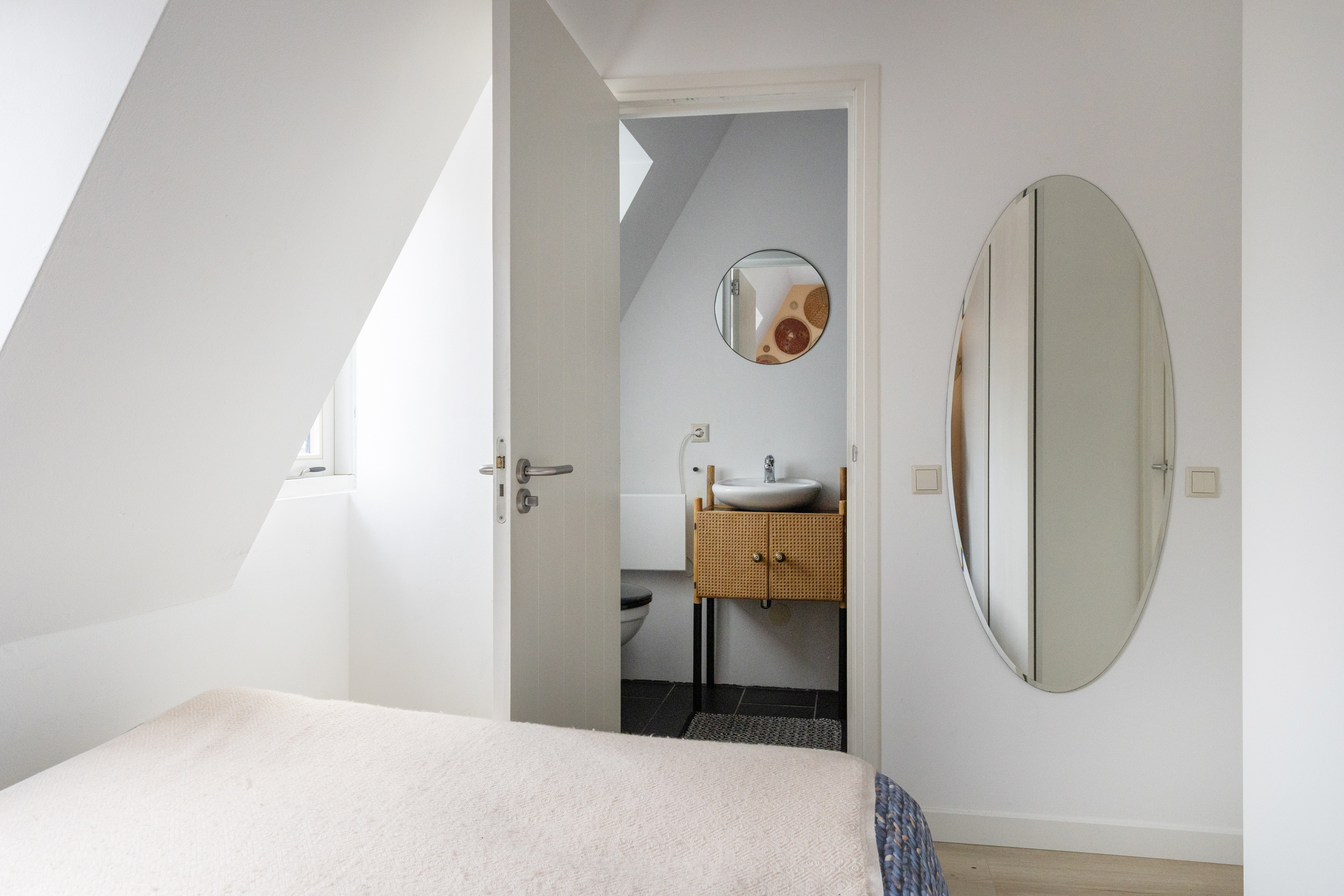 Aan de voorzijde ligt de knusse slaapkamer met plek voor een tweepersoonsbed en kledingkast. De naastgelegen badkamer is stijlvol afgewerkt en beschikt over een inloopdouche, toilet, wastafelmeubel en een raam voor natuurlijke ventilatie.