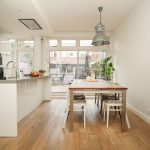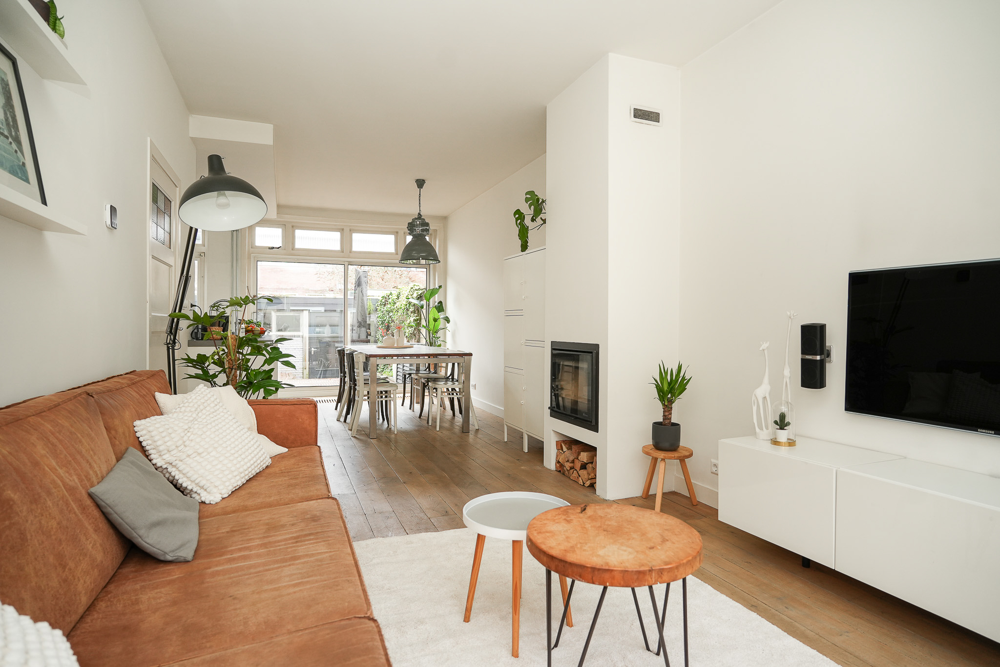 De woonkamer is licht en sfeervol, met een mooie houten vloer, een open haard en een erker met glas-in-lood aan de voorzijde. Aan de achterzijde loopt de leefruimte door naar de eetkamer met open keuken en schuifpui naar de tuin.