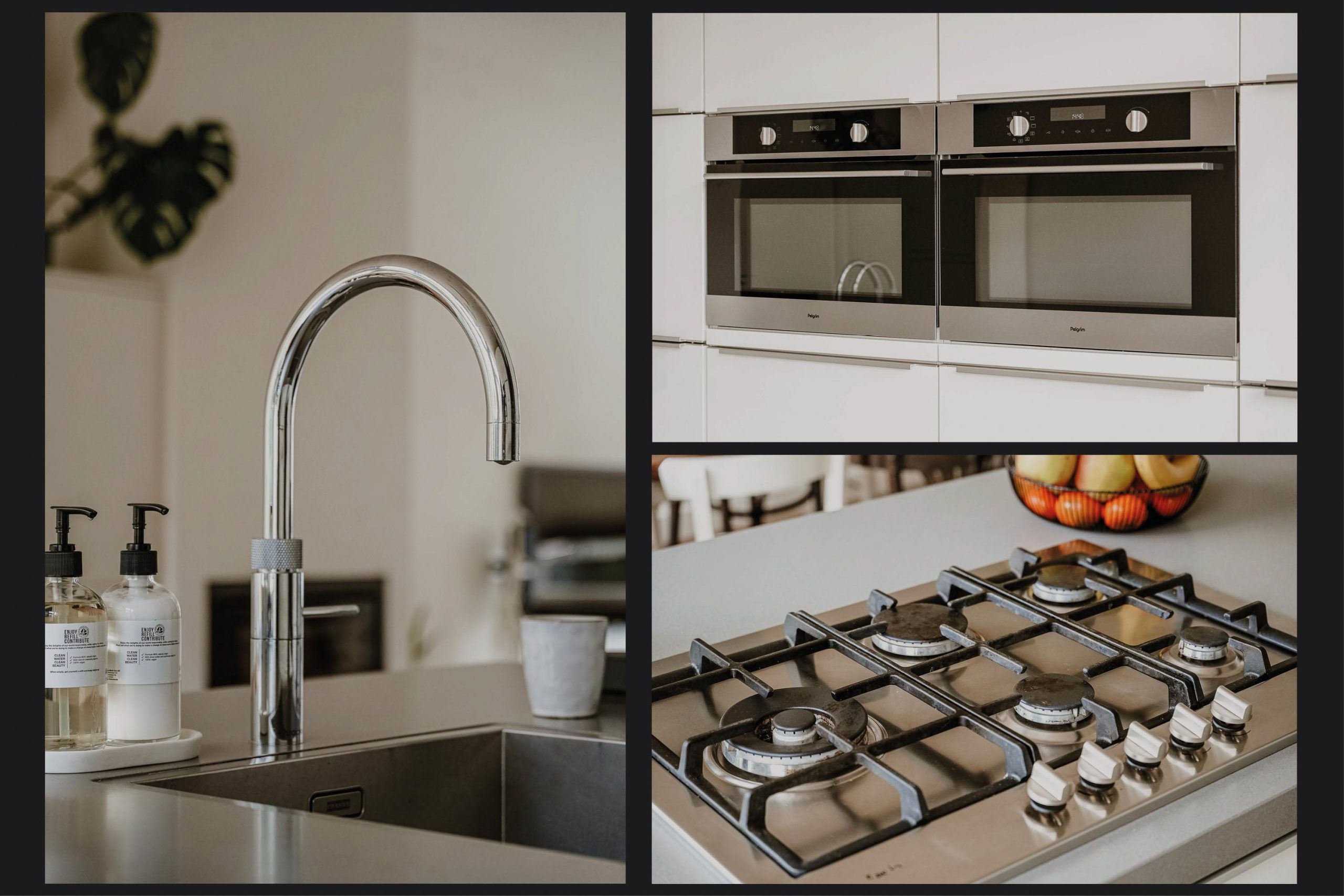 De open keuken is in 2015 compleet vernieuwd en nog steeds helemaal van nu. Denk aan een kookeiland, vijfpits gaskookplaat, afzuiging, twee identieke combi-ovens, vaatwasser, koelkast, vriezer en volop bergruimte dankzij de hoge kasten. De Quooker is in 2024 vernieuwd. Koken wordt hier echt een feestje.