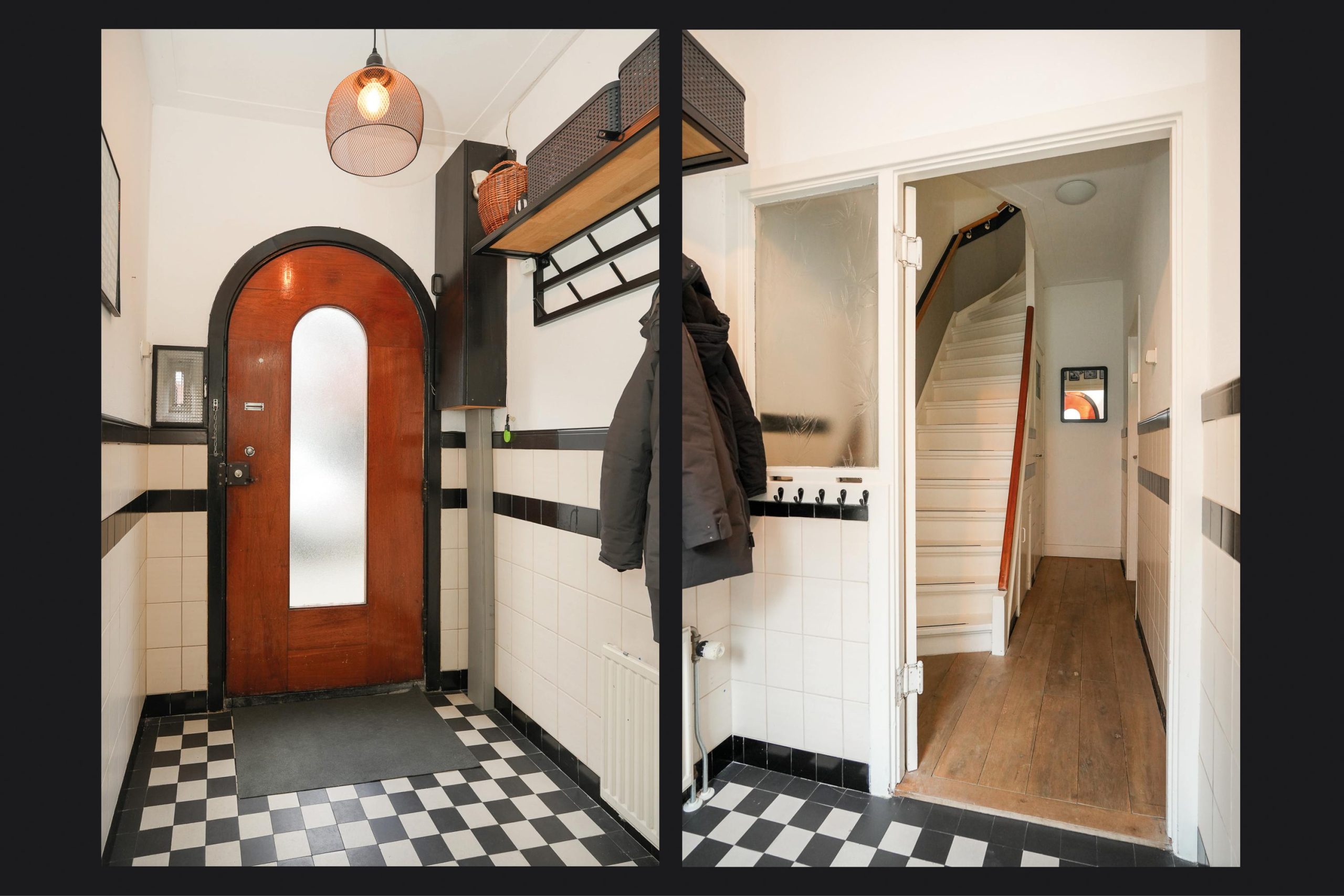 De entree is een echte binnenkomer met de zwart-witte tegelvloer, de fraaie houten voordeur met ronde afwerking en het glas-in-lood. De hal is ruim opgezet en geeft toegang tot het aparte toilet en de trap naar boven.