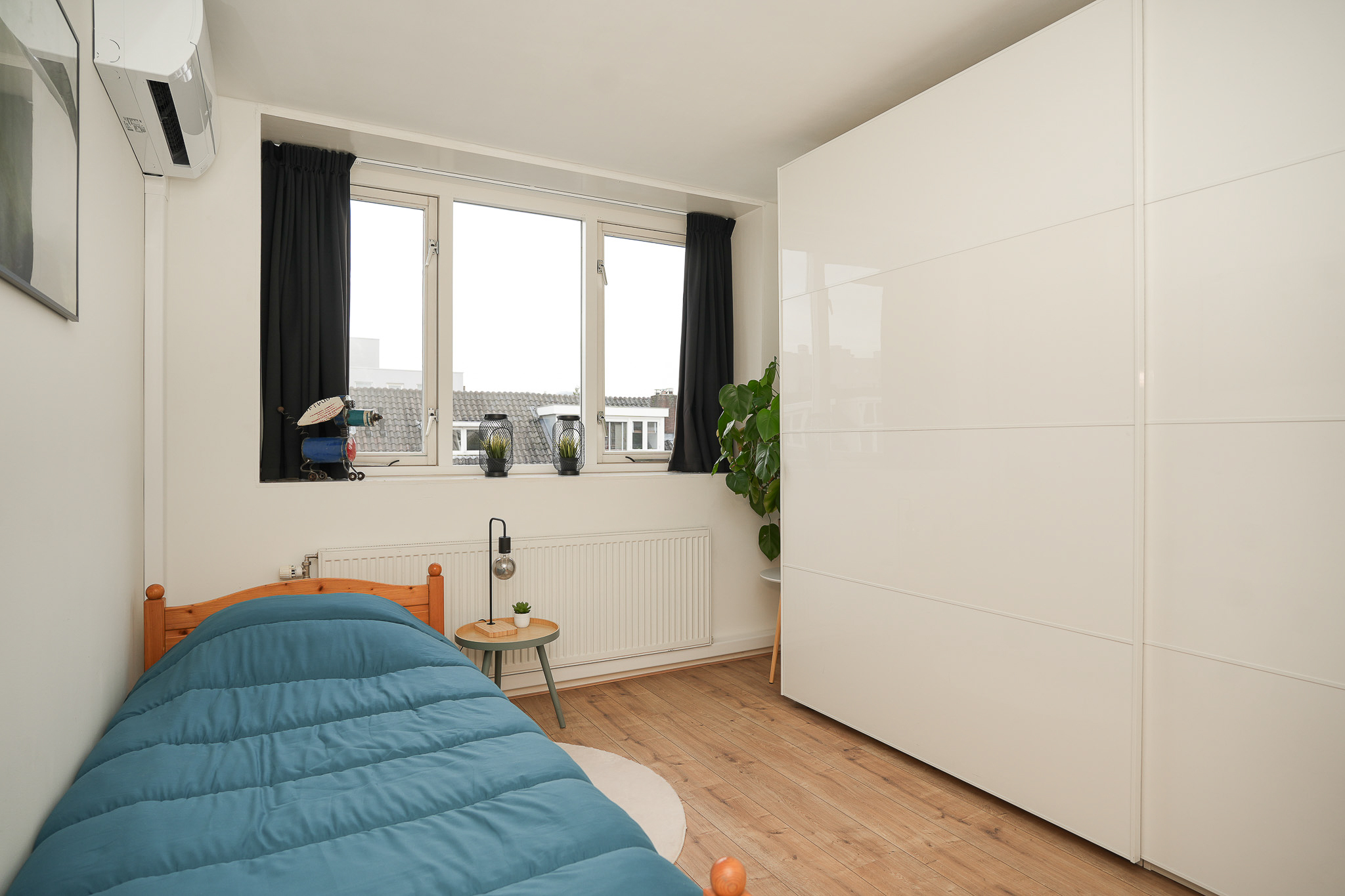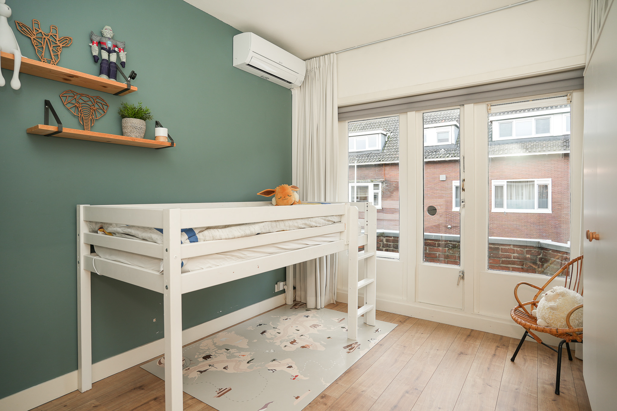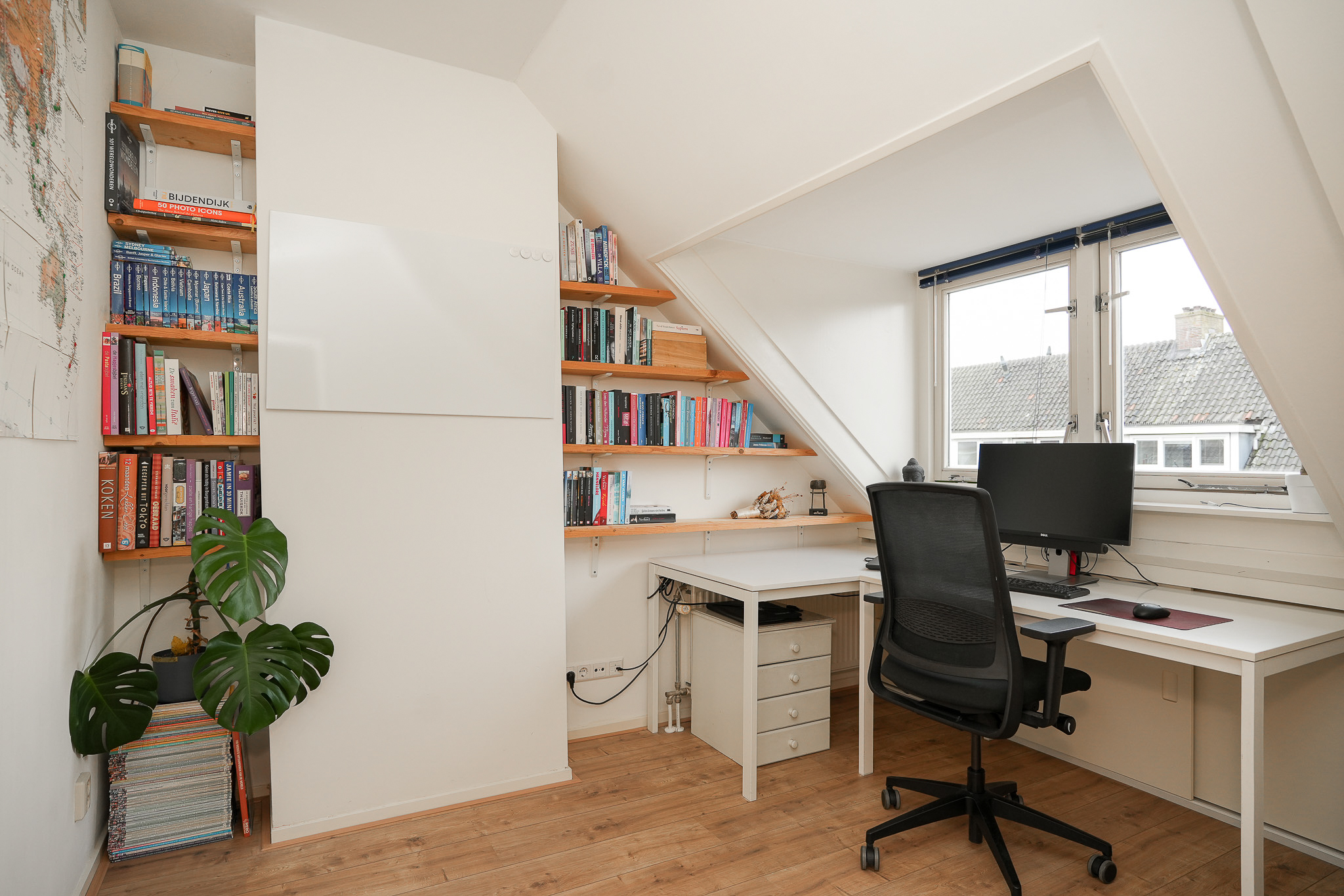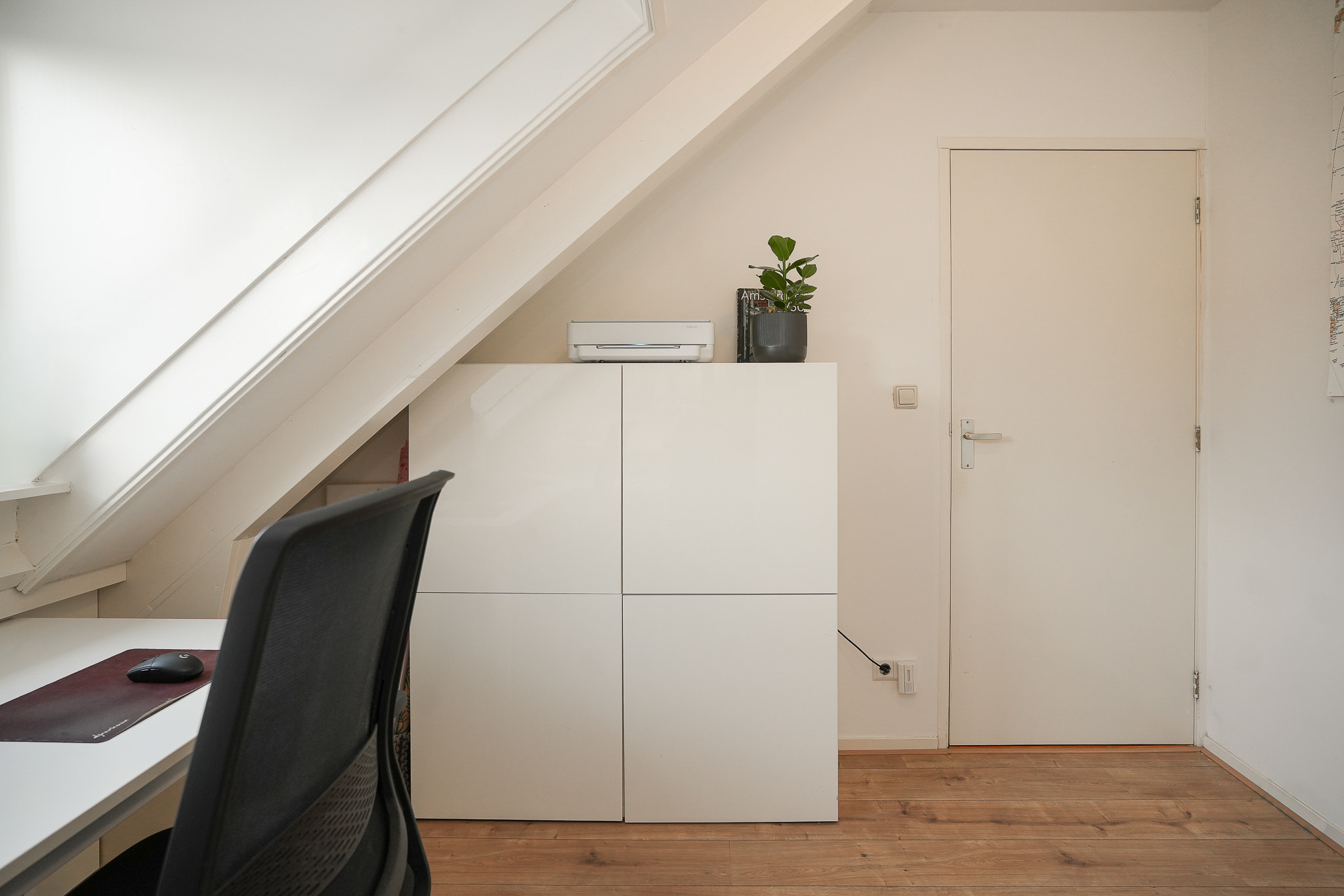 De verdieping is verrassend ruim door de dakopbouw aan de achterzijde en een dakkapel aan de voorzijde. Aan de voorzijde ligt een prettige kamer, ideaal als werk- of slaapkamer met lekker veel lichtinval. Aan de achterzijde bevindt zich een ruime slaapkamer eveneens zeer licht door de grote ramen en voorzien van airco. De diepe vensterbank geeft een leuk effect en is perfect als knusse zitplek met een paar kussens.