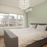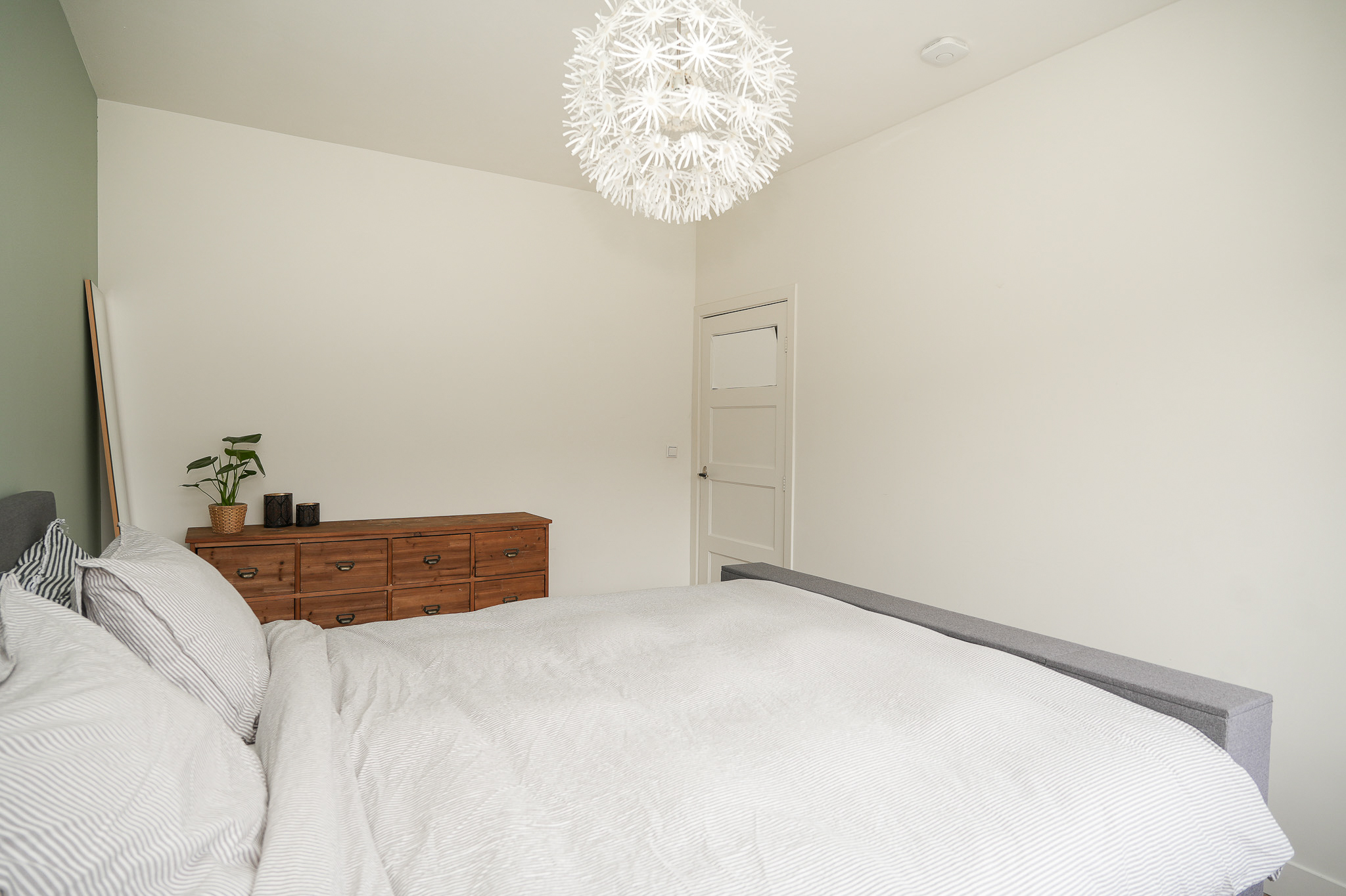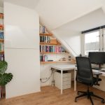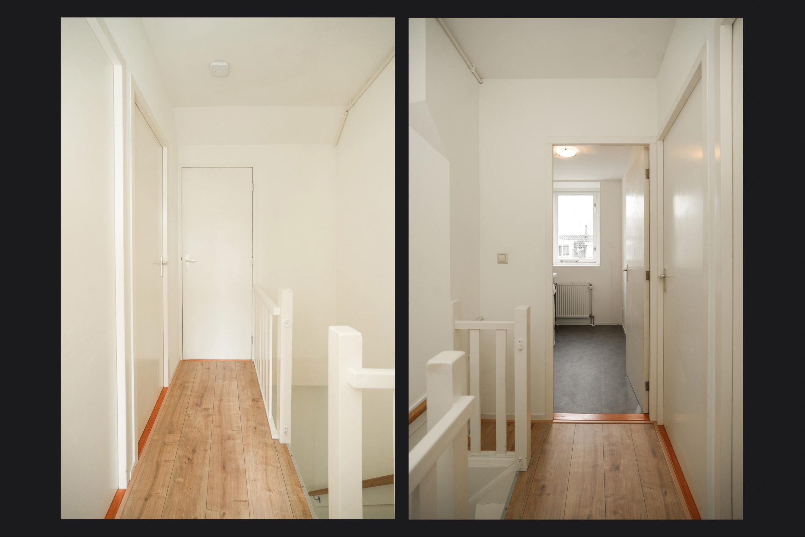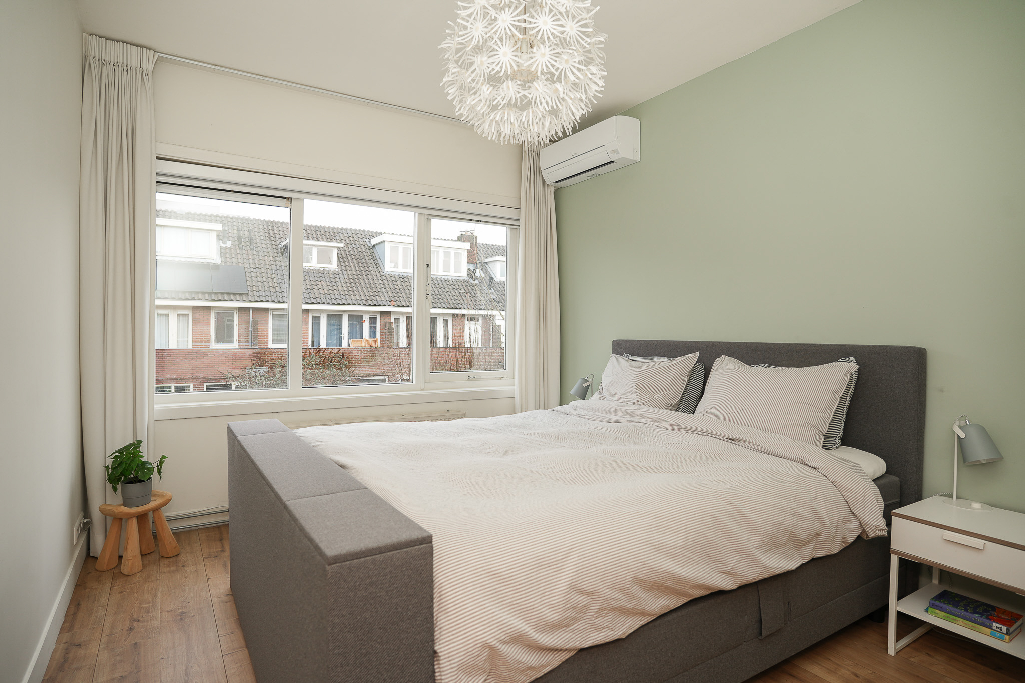 De verdieping is verrassend ruim door de dakopbouw aan de achterzijde en een dakkapel aan de voorzijde. Aan de voorzijde ligt een prettige kamer, ideaal als werk- of slaapkamer met lekker veel lichtinval. Aan de achterzijde bevindt zich een ruime slaapkamer eveneens zeer licht door de grote ramen en voorzien van airco. De diepe vensterbank geeft een leuk effect en is perfect als knusse zitplek met een paar kussens.