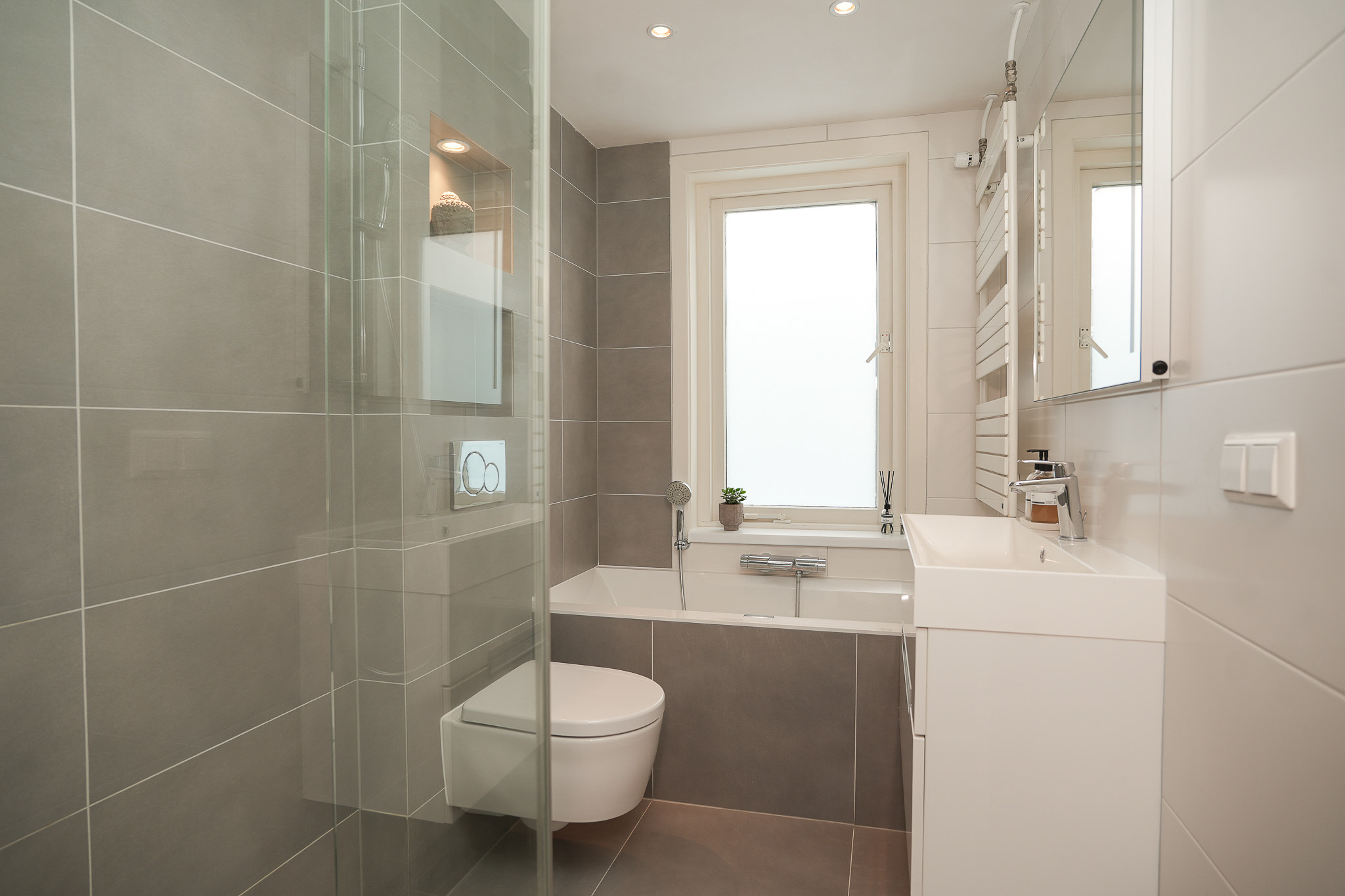 De badkamer is in 2015 volledig vernieuwd en modern afgewerkt met ligbad, douche, hangend toilet, wastafelmeubel, designradiator en extra comfort zoals een verwarmde spiegel.
