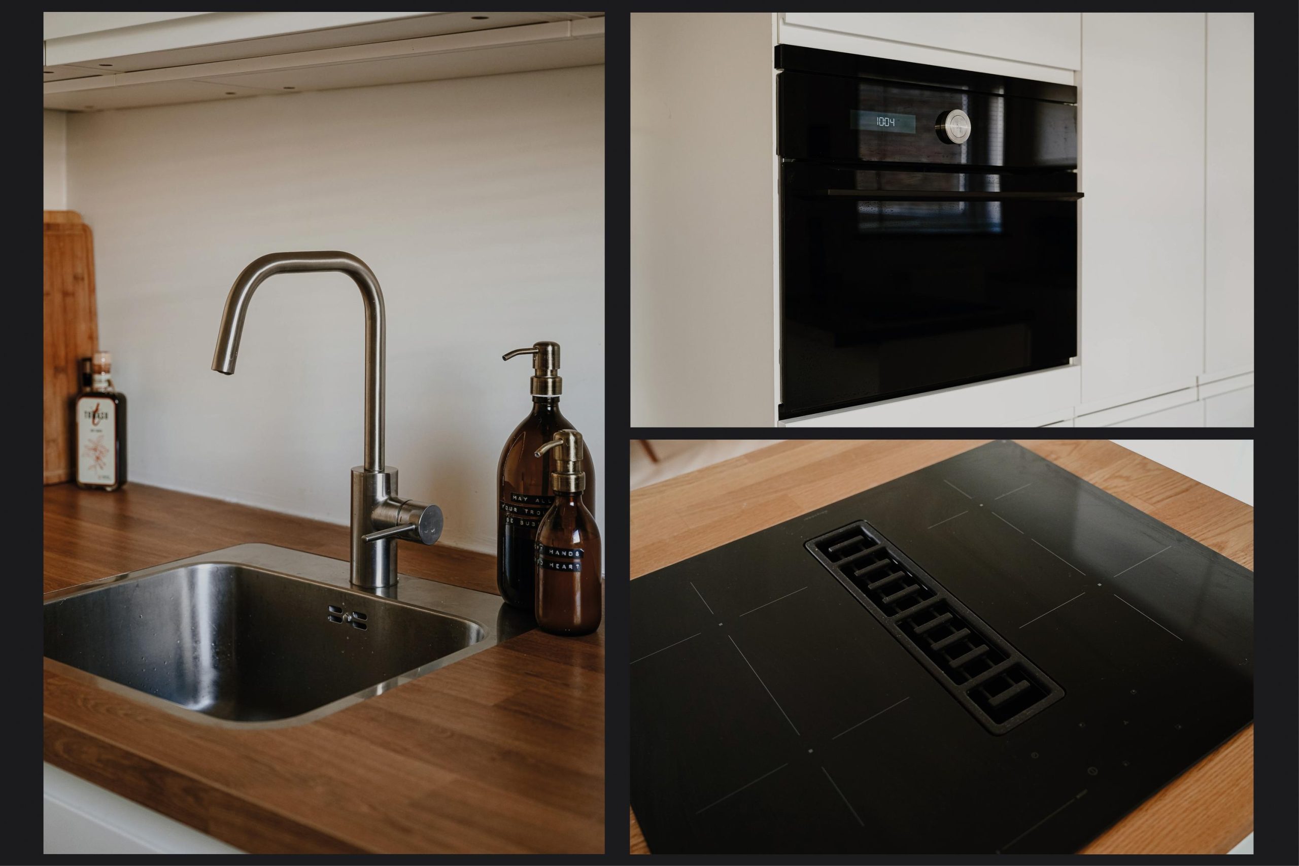 De open keuken is praktisch en compleet uitgevoerd met een 4 pits inductiekookplaat met afzuiging, vaatwasser, combi oven magnetron en combi koel vriescombinatie
