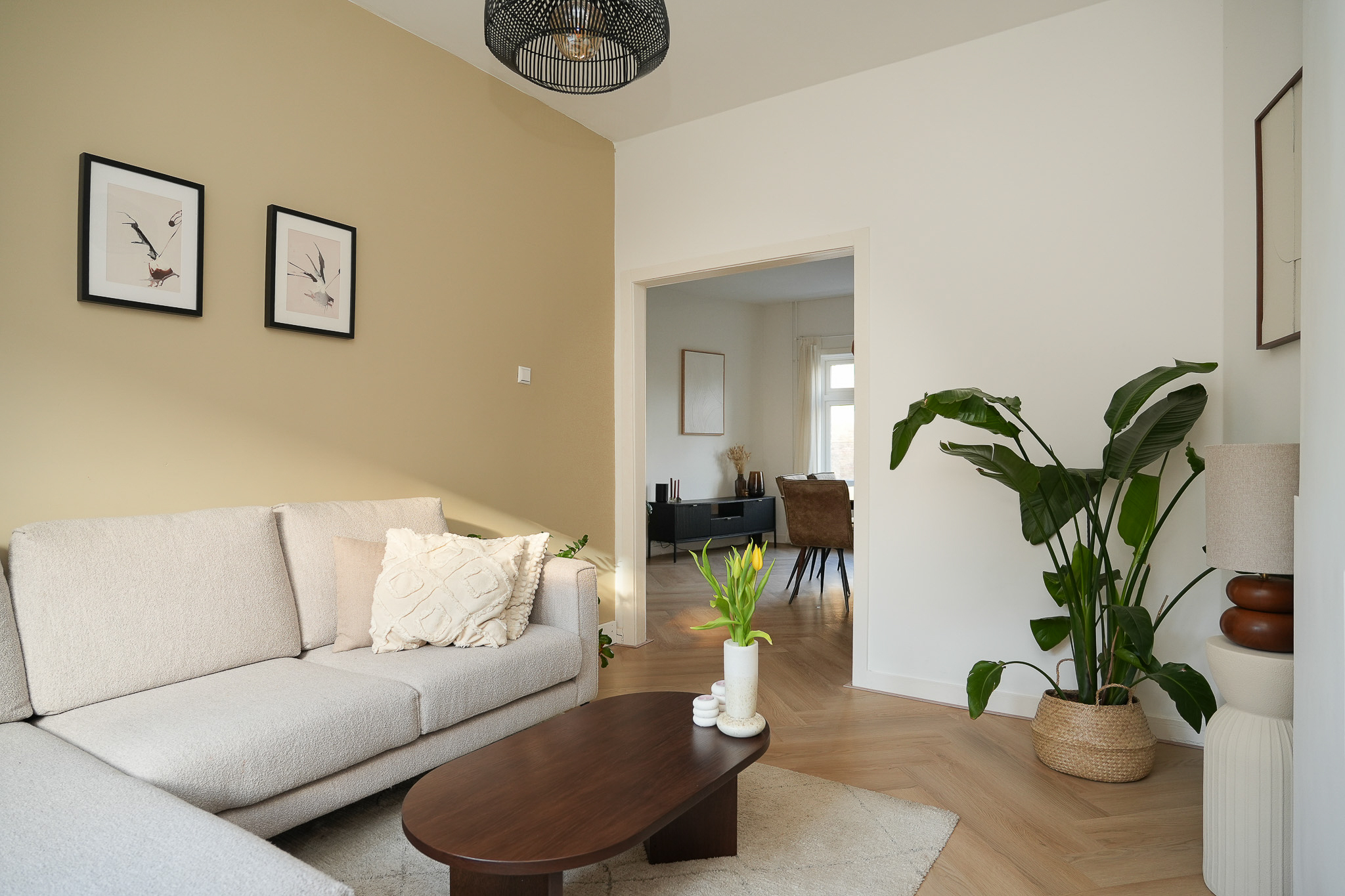 Vanuit de eetkamer loop je door naar de zitkamer aan de voorzijde. Hier zit je heerlijk licht en sfeervol, met de schouw als echte blikvanger. Een fijne plek om te ontspannen, met genoeg ruimte voor een comfortabele zithoek.