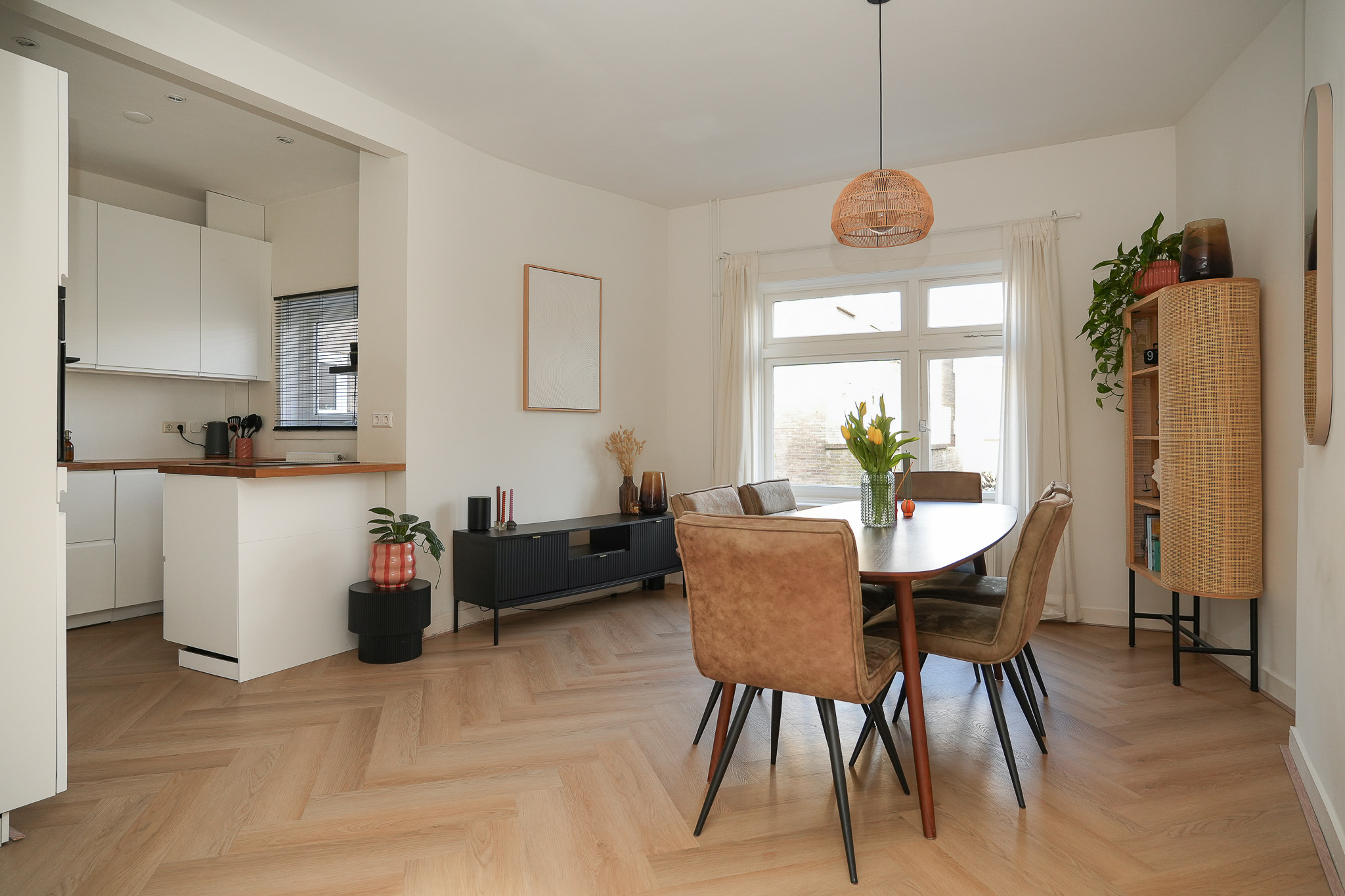Boven kom je in de hal met ruimte voor garderobe en toegang tot alle vertrekken. Hier vind je ook het moderne toilet met fontein. Vanuit de hal loop je als eerste de eetkamer in met aansluitend de open keuken. Dit is een heerlijke leef plek waar je uitgebreid kunt tafelen en waar koken en gezelligheid vanzelf samenkomen. Extra fijn zijn de twee vaste kasten in de eetkamer, ideaal voor servies, voorraad en alles wat je graag netjes uit het zicht houdt.